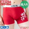 真っ赤な下着に筆文字で「3回目のはたちです。」とデザインされたボクサーパンツです。