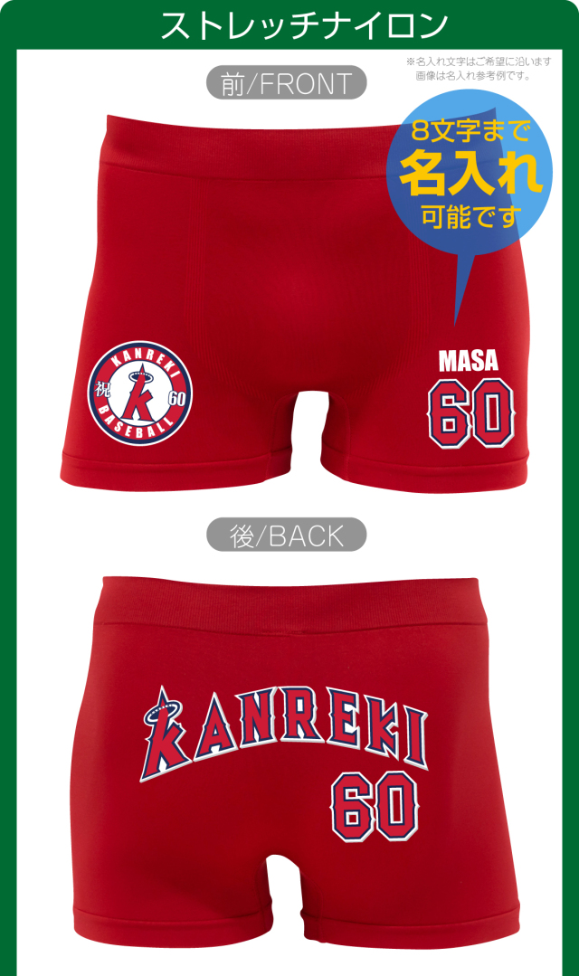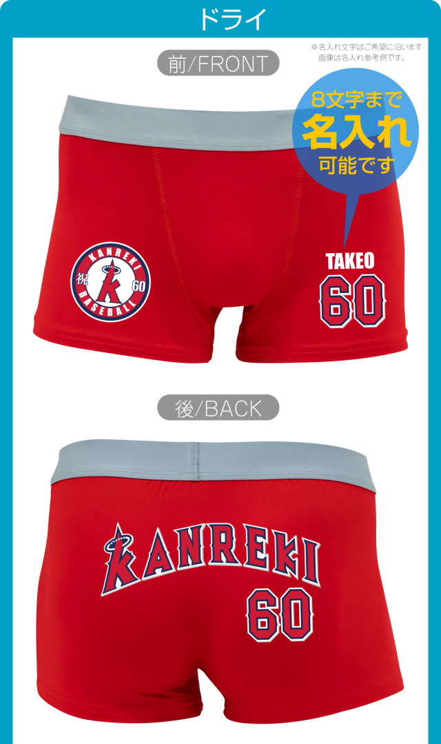 野球好きな方への贈り物「ユニフォーム」デザインが最高! シャレもんオリジナル還暦祝い用ボクサーパンツです。 同窓会の記念品にもオススメ! ちゃんちゃんこ代わりに父・母にプレゼントしてみては? しっかりとした生地に耐久性の良いプリントをしております。 好きな名前は8文字まで入力してください。 名入れ文字(8文字までアルファベットで入力してください) ※こちらへ記入していただいた文字をそのままコピーしてプリント致します。 ひらがなをローマ字変換等のサービスはしておりません。 ■ご注文時にご記入いただいた「名入れ希望文字」の、ご注文後の文字変更はできません。 ■パンツタイプは3タイプからお選びいただけます。 ・コットンパンツ(前開き) ・ドライパンツ ・ストレッチナイロンパンツ ■サイズをお選びただけます。 ※パンツタイプによって選択可能サイズに制限がございます。