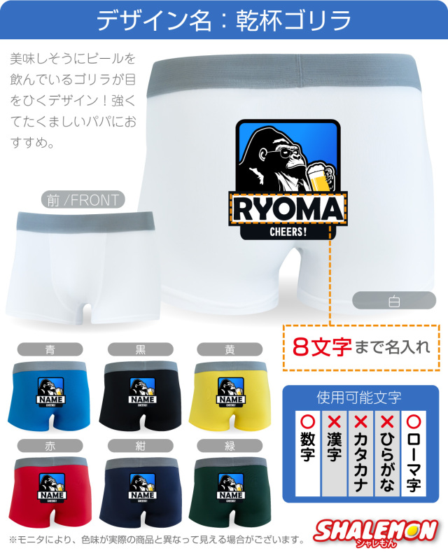 【 ボクサーパンツ 名入れ 選べる 父の日 デザイン 】 日頃の感謝の思いを伝えるプレゼントに 実用的なボクサーパンツはいかがでしょうか? 名入れをして世界にひとつだけのオリジナルギフトに◎ ビール好き、釣り好き、野球好き、などなど お好きなデザインをお選びください! ■選べるボクサーパンツカラー ・赤 ・黄 ・白 ・黒 ・青 ・紺 ・緑 ■サイズを選択ください ・S ・M ・L ・XL ・XXL ■デザインをお選びいただけます。※( )内は名入れ文字制限数 1.Daddy(8文字まで) 2.親父だもの(5文字まで) 3.父の日ペンギン(6文字まで) 4.ビールバンザイ(5文字まで) 5.父フェイス(6文字まで) 6.パパエアー(6文字まで) 7.オトーン(8文字まで) 8.ボスゴリラ(8文字まで) 9.釣りラベル(6文字まで) 10.乾杯ゴリラ(8文字まで) 11.最高の父(8文字まで) 12.パパ専用(5文字まで) 13.パパ眼鏡(8文字まで) ラッピングは無料ですので必要の場合は、ラッピングの有無をご選択ください。