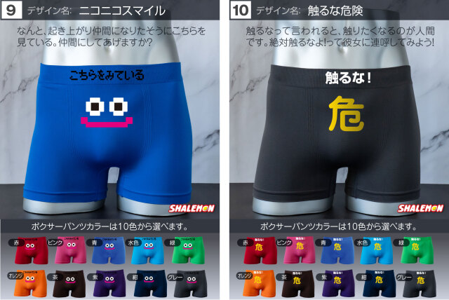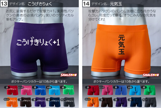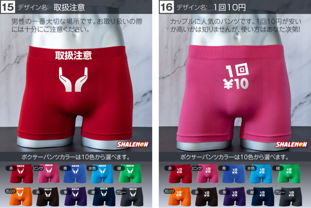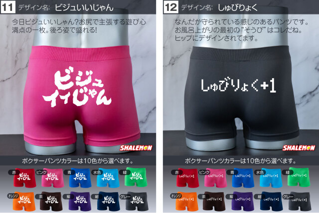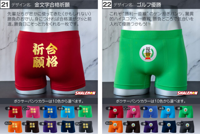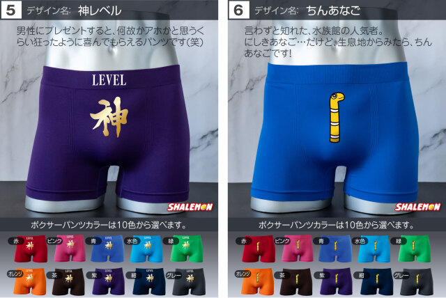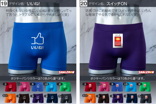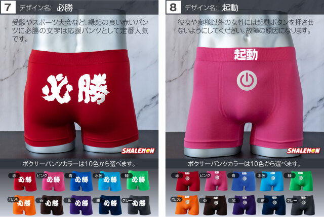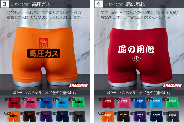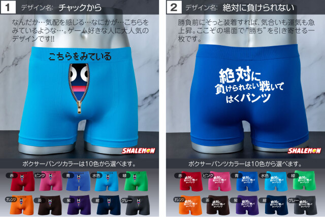 お好きなデザインと、お好きなカラーを組み合わせて あなた好みのボクサーパンツをチョイスしよう! プレゼントの場合、相手のボクサーパンツのサイズがよくわからない… そんな声にこたえて!フリーサイズの登場です! 驚異の伸縮で、一般的な方でしたら問題なく着用できます! ビビるくらい伸びます(笑) 履き心地も柔らかくて最高! プリント部分は100回洗っても、色落ちはほとんどございません。 ※漂白系洗剤やタンブラーを使用はしないでください。パンツに限らずどんな衣類も劣化します! よくあるプリントだけして販売する業者ではございません。 安心とデザインが魅力のシャレもんパンツを一度お試しあれ!! 【デザイン】 1.チャックから 2.絶対に負けられない 3.高圧ガス 4.屁の用心 5.神レベル 6.ちんあなご 7.必勝 8.起動 9.ニコニコスマイル 10.触るな危険 11.ビジュいいじゃん 12.しゅびりょく 13.こうげきりょく 14.元気玉 15.取扱注意 16.1回10円 17.金ことぶき 18.浮気禁止 19.いいね! 20.スイッチON 21.金文字合格祈願 22.ゴルフ優勝 23.ニアピン賞 24.ブービー賞 【サイズ】 フリーサイズ 伸縮性が高い生地で幅広いサイズに対応しています。 【組成】 ナイロン90% ポリウレタン10% 【ご注意】 ※プリントなし(無地)ご選択の場合、デザインをお選びいただいても無地での発送となります。 ※お使いのモニター設定、お部屋の照明等により実際の商品と色味が異なる場合がございます。 ※商品のデザイン、仕様、価格は予告なく変更する場合がございます。