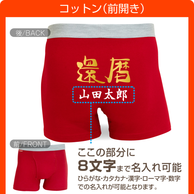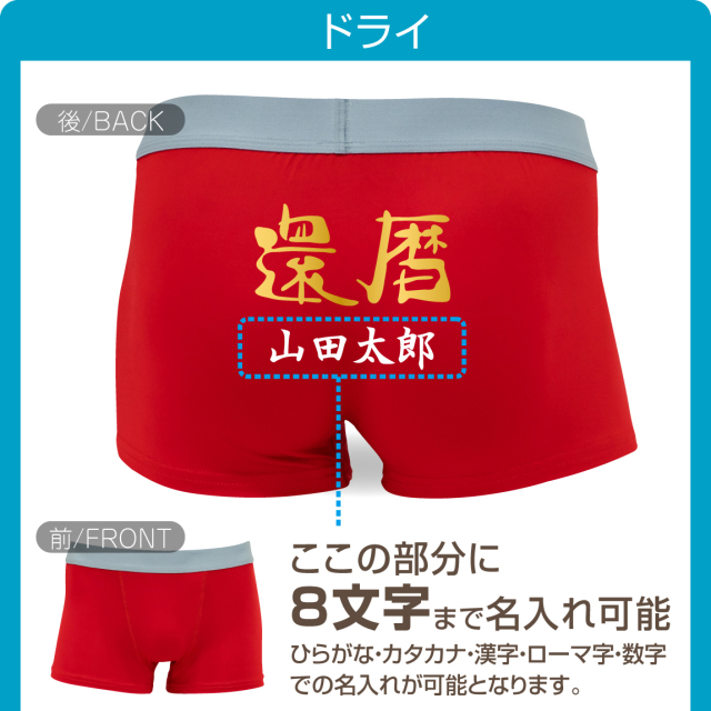 弊社オリジナルの高品質の生地とプリントが自慢の逸品です。 豪華な金文字還暦赤パンツのヒップ部分にお好きな文字を8文字まで名入れ(オリジナルプリント)致します。 同窓会の記念品にもオススメ! 文字は黒色(筆文字)になります。※特殊文字は避けてください。 ご希望の文字(8文字まで)を記入してご注文ください。