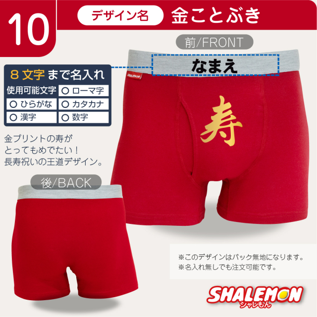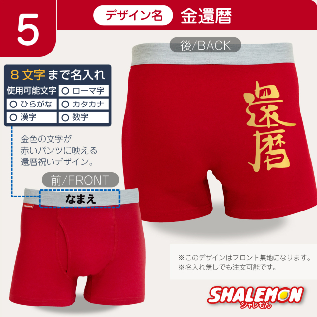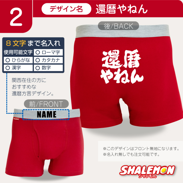 還暦祝いにぴったりな赤いボクサーパンツ! 豪華金文字で「還暦」のデザインなど、縁起のいい選べる還暦デザイン。 赤いちゃんちゃんこはちょっと…、という方にも◎ 60歳の誕生日や同窓会の記念品、上司やお友達、親戚への贈りものにもおすすめ! ユニークで実用的な一品です! ■パンツタイプは[2種類]からお選びいただけます。 ・コットン(前開き) 綿100%の通気性がよく履き心地の良いボクサーパンツ。 ・ドライ 吸汗速乾に優れ伸縮性抜群のボクサーパンツ。 ■サイズをお選びただけます。 ※パンツタイプによってサイズ展開が異なります。 ・コットン(前開き) M/L/XL ・ドライ S/M/L/XL/XXL ■デザインをお選びただけます。 1.金還暦 2.3回目のはたち 3.還暦フェイス 4.Canreki 5.かんれきだもの 6.還暦エアー 7.還暦バンザイ 8.還暦祝いゴールド扇子 9.還暦野球 10.還暦カフェ 11.生涯現役 ※プリント位置はデザインにより異なります。 【ご注意】 ※お使いのモニター設定、お部屋の照明等により実際の商品と色味が異なる場合がございます。 ※サイズによりプリントの大きさやバランスが異なる場合がございます。 ※商品のデザイン、仕様、価格は予告なく変更する場合がございます。