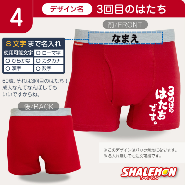 | 製品名: | 還暦祝い ボクサーパンツ 還暦 ( 選べる還暦デザイン 選べるパンツタイプ ) |