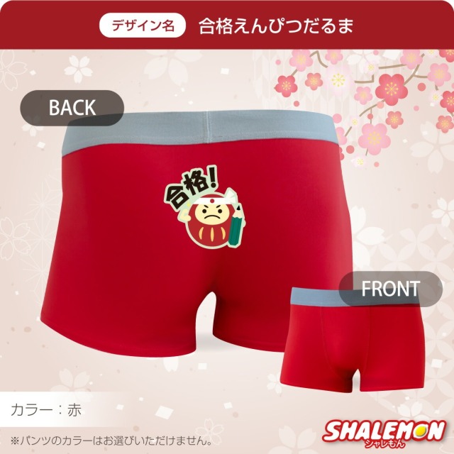 勝負の日に気合注入! 履くだけで合格率が上がる(気がする)超・縁起物。 試験中に緊張しても、このパンツがあなたのお尻を支えます。 プレッシャーに震える受験生へ、笑顔と勝利を贈る贈り物を! 【デザイン】 ・1.必勝 御守 ・2.GOKAKUダルマ ・3.がんばれだるま ・4.合格 はちまきだるま ・5.金の合格祈願 ・6.必勝 ・7.サクラだるま合格祈願 ・8.合格えんぴつだるま 【サイズ】 ・S ・M ・L ・XL ・XXL 【組成】 ポリエステル90% ポリウレタン10%