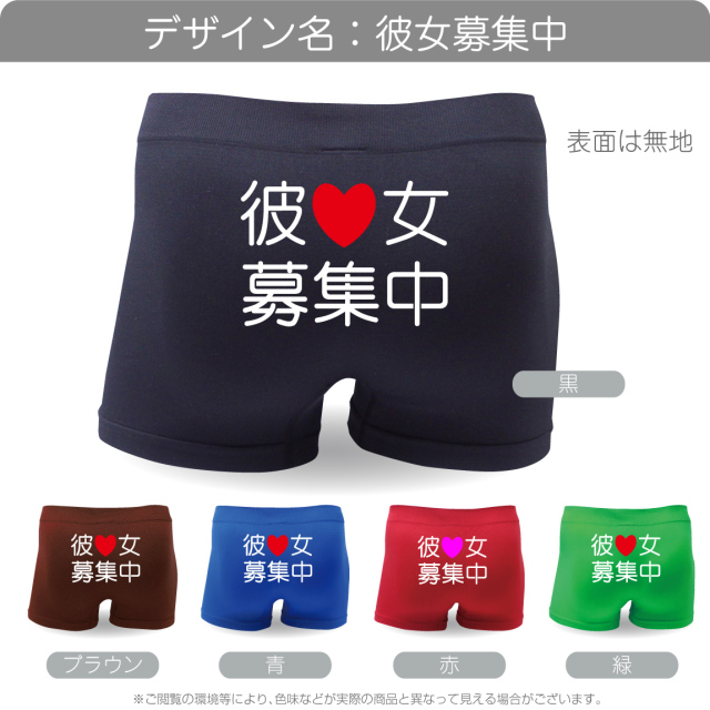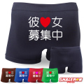 ヒップにでっかく「彼女募集中」って書いてあります。開き直って、このパンツでコンパへ行くもよし、モテなそうな友達にプレゼントするもよし(よし、じゃないですねw)。このパンツがきっかけでカップルになり、ゴールインした方いましたら、レビューでご連絡ください。当店自慢の結婚おめでとうボクサーパンツをプレゼントします(笑)