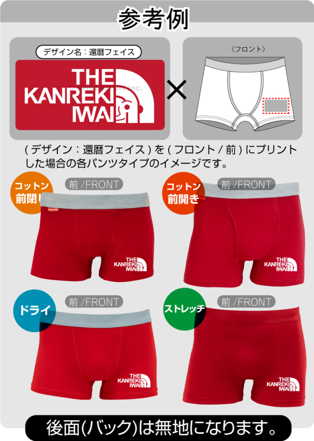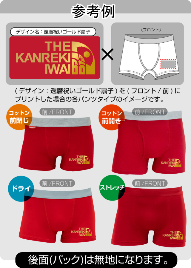 還暦のお祝いに!シャレもん ボクサーパンツです。 ■デザインを2種類からお選びいただけます。 ・還暦フェイス ・還暦祝いゴールド扇子 ■プリント面を選べます。 :フロント ・バック ■パンツタイプは3タイプからお選びいただけます。 ・コットン(前開き) ・ドライ ・ストレッチナイロン ■サイズをお選びただけます。 ※パンツタイプによって選択可能サイズに制限がございます。 同窓会の記念品にもオススメ! 好きなカラーをお選びいただけます。