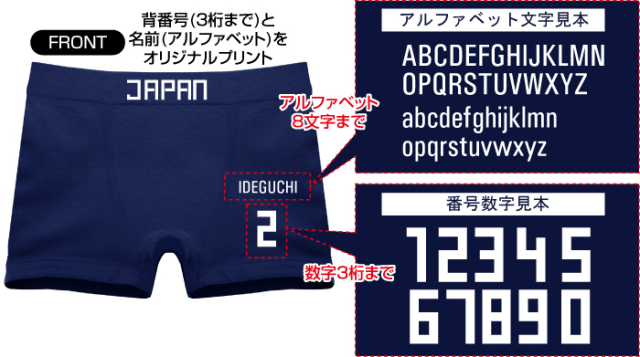 番号と名前(アルファベット)をオリジナル名入れプリントできるボクサーパンツです。世界で1枚だけの素敵なプレゼントはいかがですか?