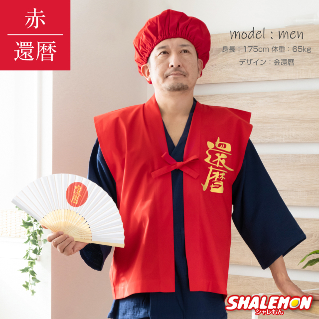 還暦祝い【ちゃんちゃんこ】と【頭巾】と【扇子】のセット男女兼用フリーサイズ素材: ポリエステル 65% コットン 35% 記念撮影にオススメな還暦祝いちゃんちゃんこと扇子がセットになって登場! 赤いちゃんちゃんこに還暦用デザインをプリント。7種類のデザインから選んでご購入下さい。※デザイン選択して購入下さい、発送後の変更は不可になりますので、くれぐれも希望デザインのお間違えの無いようお願い致します。