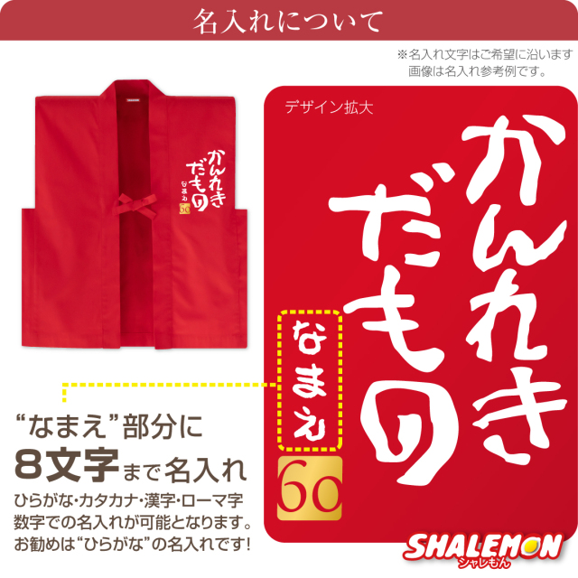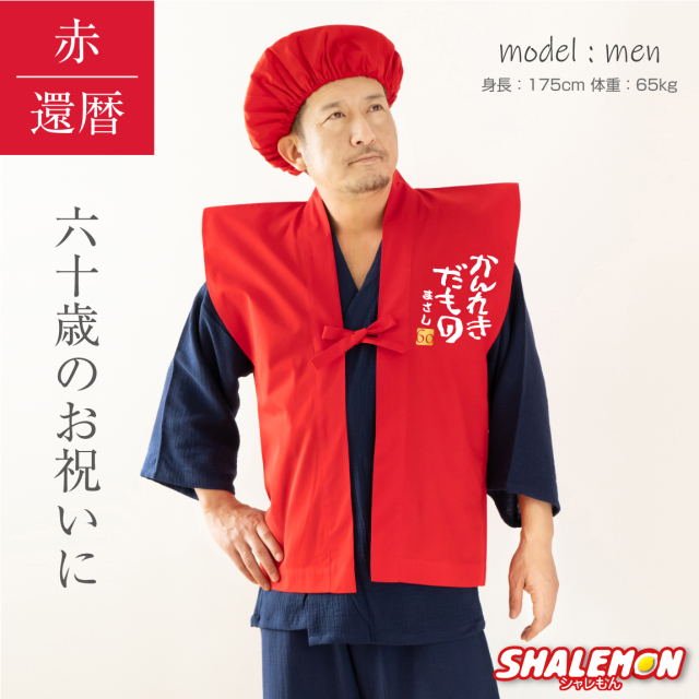 「かんれきだもの」デザインが最高! シャレもんオリジナル還暦祝い用ちゃんちゃんこ頭巾セットです。 とても和風で着心地もさらっとしてます。 同窓会の記念品にもオススメ! しかも、お名前を名入れします!! 名前の文字は白色でプリントします。 文字数は8文字(ひらがながオススメ)まで名入れいたします。 br>サイズは男女兼用フリーサイズです。 【商標登録番号6103867】“かんれきだもの”は株式会社洒落紋のライセンス商品です。 他にも還暦商品が数十種ありますので、当店シャレもんの還暦コーナーをご覧ください。 きっと、笑顔になる還暦祝いはシャレもん!!