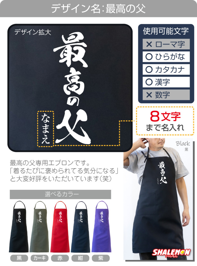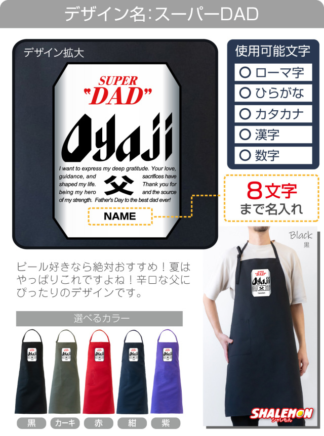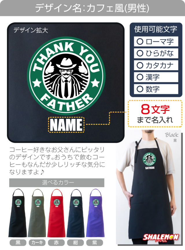 お選びいただいたデザインのエプロンにお好きな文字を名入れいたします。