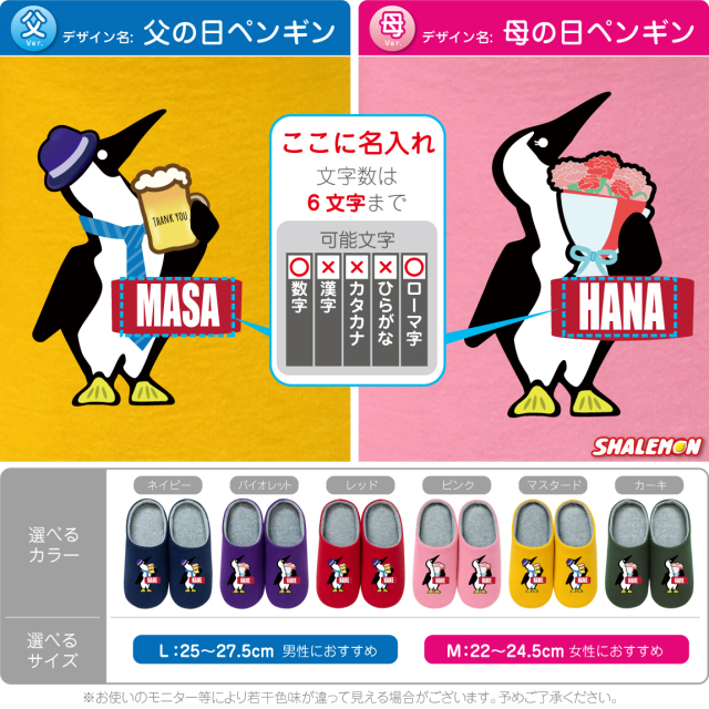 母の日だけでなく、父の日も一緒に感謝できるペアスリッパです。