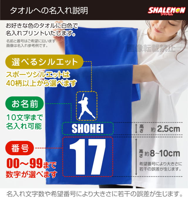 お好きな名入れ、番号、スポーツシルエットが選べるタオルです。