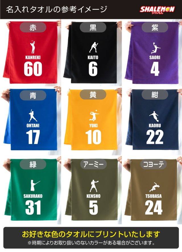 お好きな名入れ、番号、スポーツシルエットが選べるタオルです。 お洒落なタオルはシャレもん取扱いのパンツやTシャツと一緒に贈るとインパクト倍増! 同窓会の記念品にもオススメ! ■タオルカラー 赤・黒・紫・青・緑・黄・紺・アーミー・コヨーテ ■名入れ・番号 お名前はアルファベット10文字、番号は2桁までプリントできます ■スポーツシルエット(ゴルフ・野球・サッカー・テニス・卓球・ラグビー・バレーボール・バスケット・ハンドボール・バドミントン・マラソン・新体操・水泳・陸上・空手・剣道・ボクサー・柔道・相撲・競馬・ボウリング・釣り・サーフィン・スケボー・ダーツ・クライミング・ビリヤード・スノーボード・スキー 他)は選択肢からお選びください。 【ご注意】 ・名入れ文字の不備、およびデザイン未選択にてご注文をした場合、ご注文が保留となり発送が遅れますことをご了承下さい。 ・ご注文時にご記入いただいた「名入れ希望文字」の、ご注文後の文字変更はできません。 ※過激・差別・過度な下ネタ・誹謗中傷ワード等、ガイドラインに違反する場合、でご注文のキャンセルをさせていただく場合がございます。