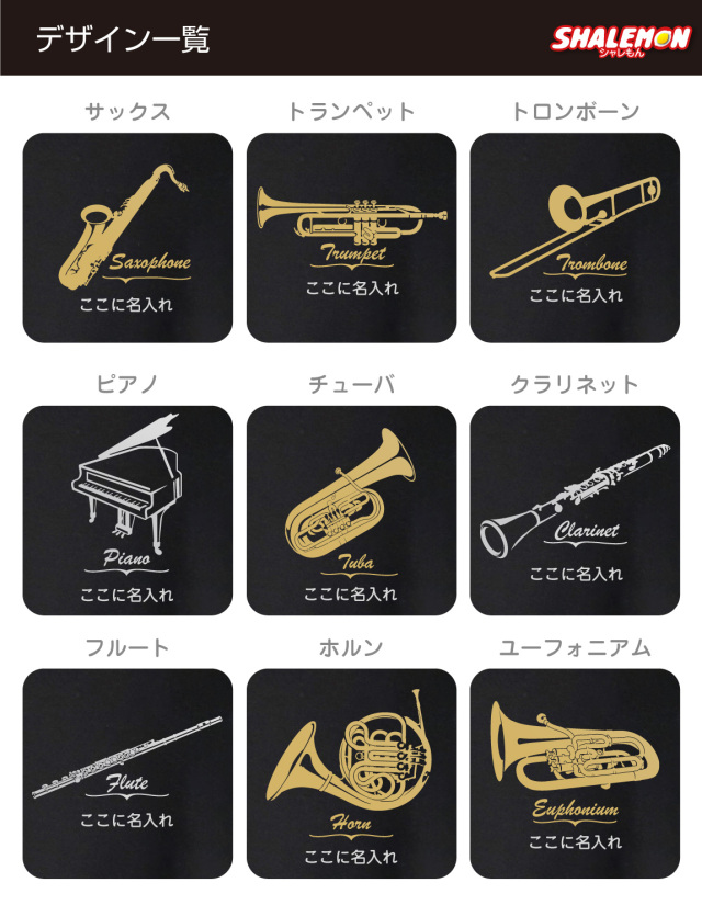 楽器にあわせたゴールド調・シルバー調のプリントとなります。