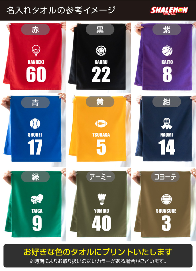 お好きな色のタオルにスポーツマークと名前と番号をオリジナルプリントします!