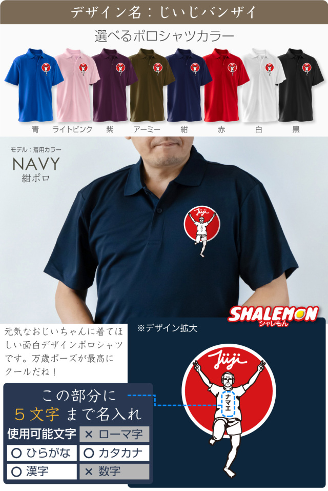 敬老の日やご長寿のお祝いに、おもしろデザインポロシャツをプレゼントして、おじいちゃんおばあちゃんを笑顔にしよう! お名前を入れられるので、世界で1枚だけのプレゼントができます! ■お好きなデザインをお好きな色のポロシャツにプリントします。